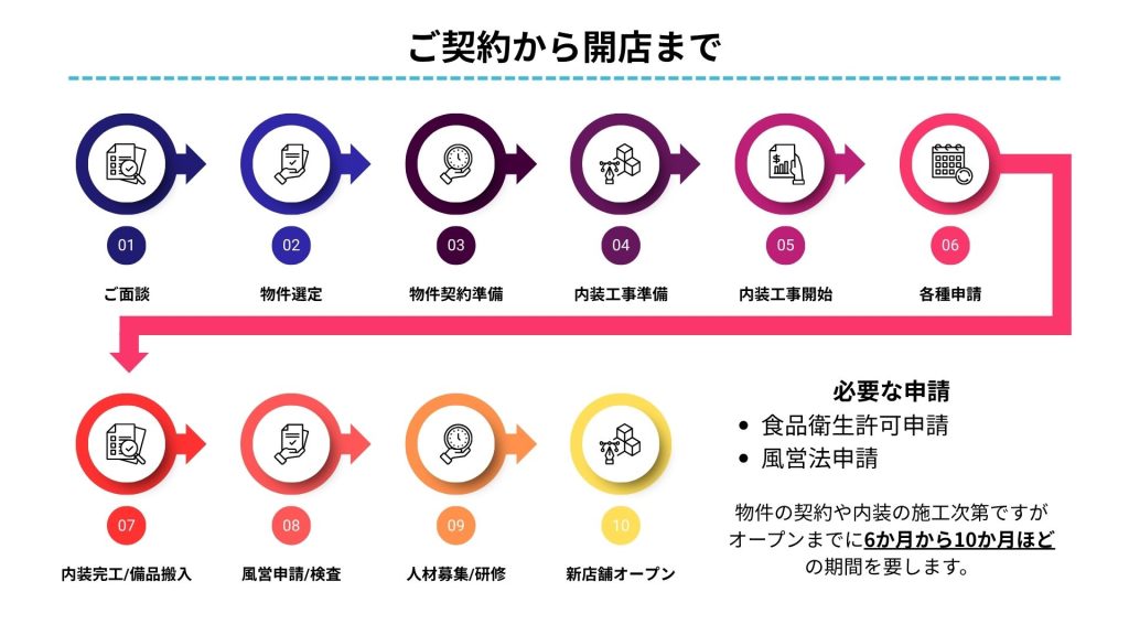物件選定、店舗づくり、必要な準備、開業までの流れなど、一つひとつ丁寧にご案内するため、初めての方でも安心して進めていただけます。